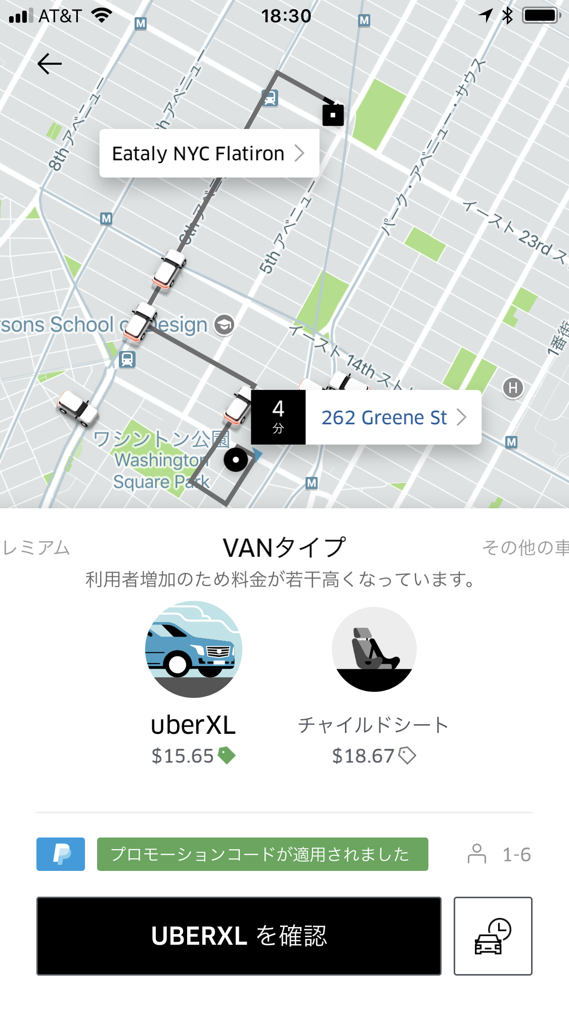 乗車してから〇分で目的に到着と表示されます。下の車種を選択。POOLは乗り合いで、かなり時間がかかることもあるのでお勧めはしません。Uber X 4人乗りが通常オーダーする車種です。