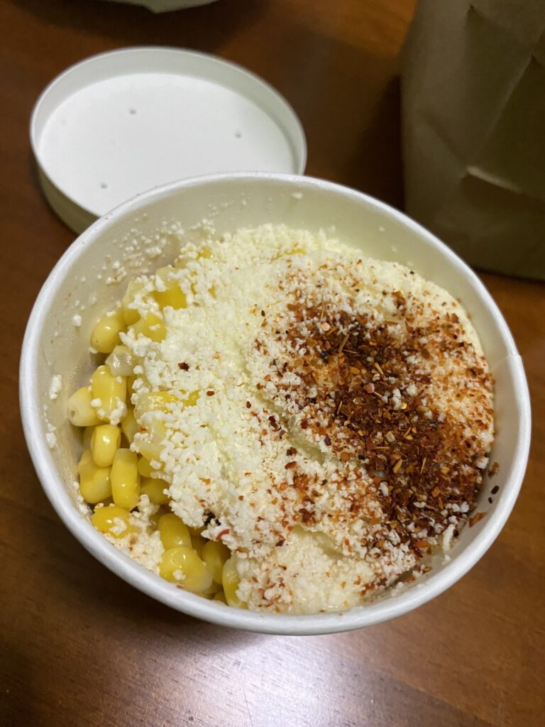 こちらはメキシコを代表する料理の一つ、トウモロコシです。日本でも屋台で焼きトウモロコシを売っているのをよく見かけますが、メキシコでも屋台のトウモロコシは大人気だそうです。串刺しのトウモロコシにマヨネーズ、チーズ、チリパウダー、ライムを塗ったものをElote/エローテと呼ぶのですが、カップに入っているものをエスキーテと呼ぶそうです。マヨネーズやチーズたっぷりのサラダですが、ライムの酸味が効いていてとても食べやすいです。私の一番のお気に入り!