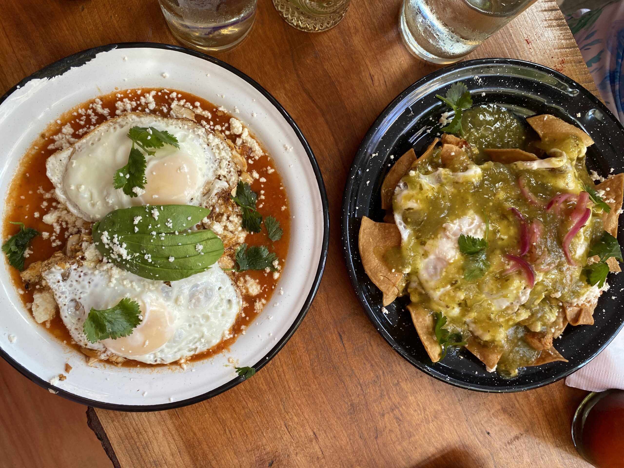 トルティーヤをカリカリに揚げてサルサやソースをかけたもの。目玉焼きも載っています。